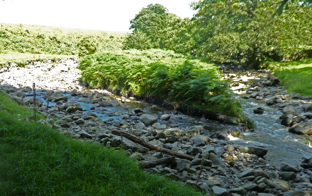 | The streams divide. I followed left until I had to bail-out as the gill became too narrow and overgrown and was also barred by a high barbed wire fence, I guess to put off deer |