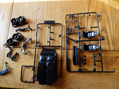 | This kit has three modules: chassis and wheels, interior tub, and the body, Here all the parts for the first module ready to be given a coat of grey primer. |